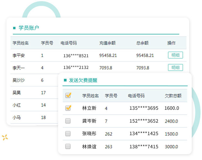 学员档案、教学回访、学员筛选、活动推送、欠费提醒、休学结业