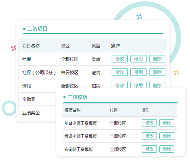 收支流水、账户管理、销售业绩、课时提成、工资账单