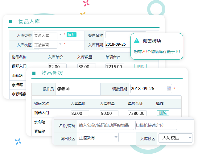 学员登记、报表缴费、学员考勤、购买教财、积分兑换等业务办理