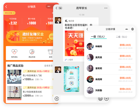 分销场景:学生家长推荐亲朋好友、小孩同学,资源变现;不同业务类型机构可相互引流,资源共享,互利共赢