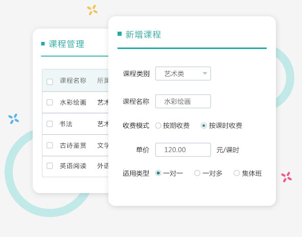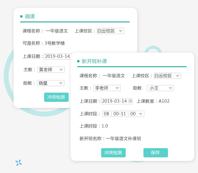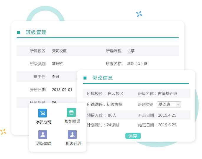 课程设置(按期/课时/时间)、开班分班、转班转课、通用课时