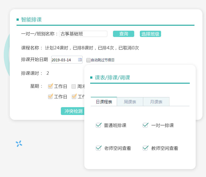 一对一/一对多/集体班排课、规律性/非规律性排课、调课/加课