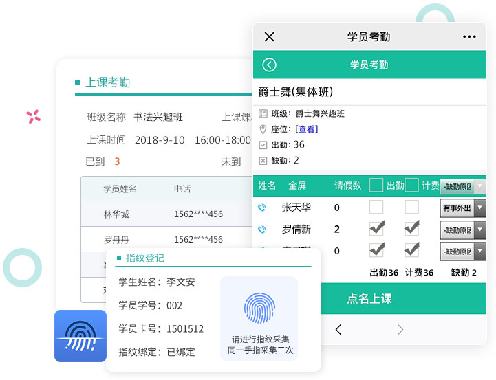 刷卡/指纹/手机点名考勤、考勤消课、签到通知