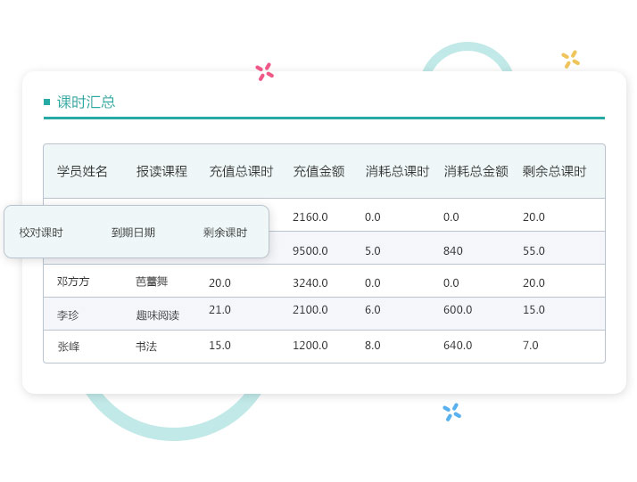 课时汇总、即时课消、教师课消、消课通知、到期提醒