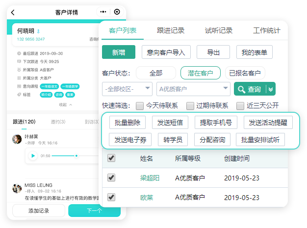 学员档案、教学回访、学员筛选、活动推送、欠费提醒、休学结业