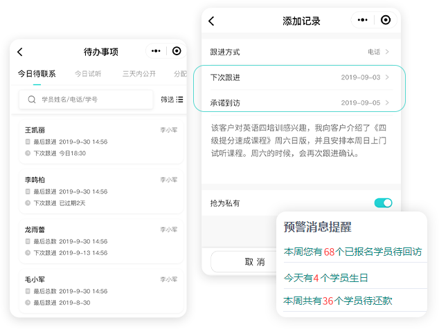 生日客户、承诺上门、试听安排等每日待办事项自动推送,不错过最佳销售时机