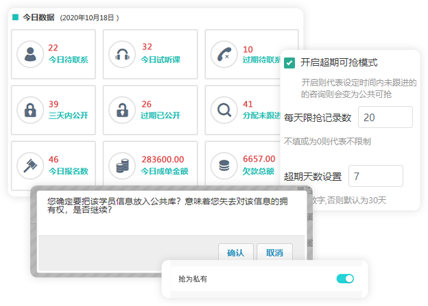 咨询师接待客户人数、跟进次数、试听安排人数等销售数据自动汇总,量化KPI考核,打造狼性销售铁军