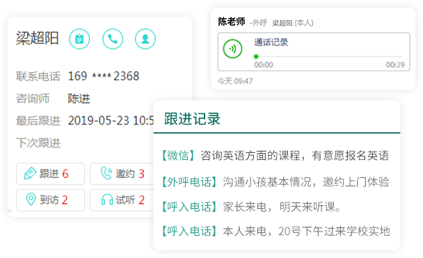 手机随时跟进意向学员,添加回访记录,跟进轨迹一目了然,销售不断档,转化有保障