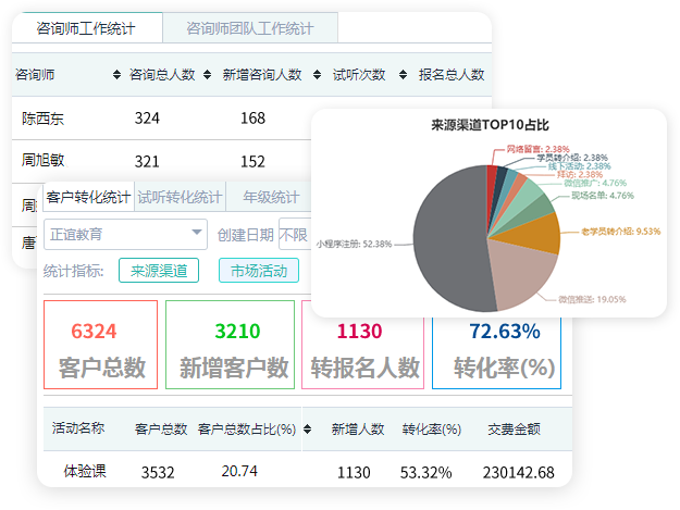 客户来源渠道、等级分布、转化率多维度数据统计,图形化展示,便于决策者及时调整招生策略,提升销售转化率